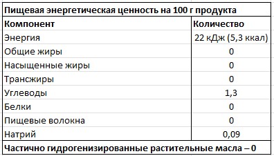 Состав: Вода, желейный порошок, ароматизатор для улучшения вкуса (ацесульфам Е950 (0,03%), заменитель сахара (аспартам Е951 (0,06%), сукралоза Е955 (0,25%), регулятор кислотности (лимонная кислота Е330), консервант (сорбат калия), искусственные ароматизаторы (клубника, яблоко, ананас, виноград), натуральные цвета (E141, E160a, E120, E163).